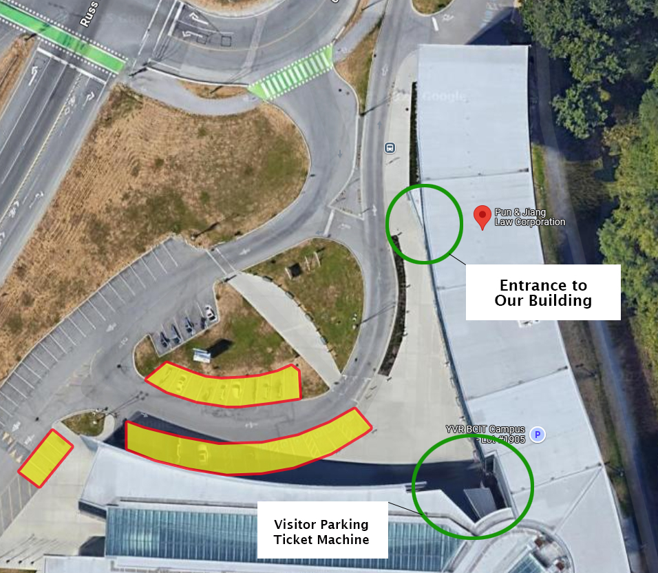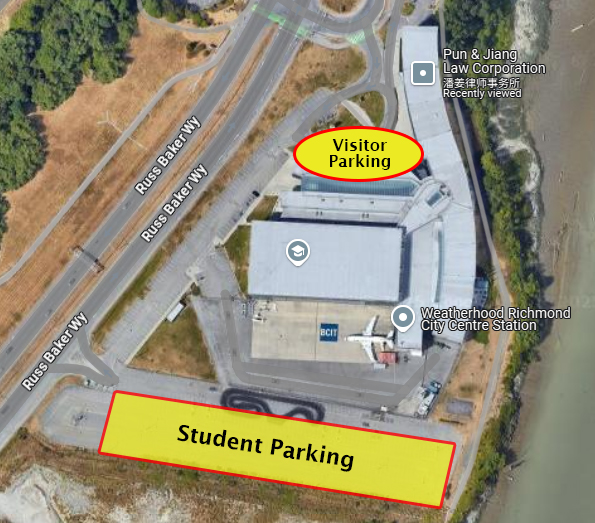 Please park in the Visitor Parking Lot under the “BCIT” logo. The areas highlighted in yellow are visitor parking spots. Please read the parking signs carefully, as there are restrictions attached to certain spots.