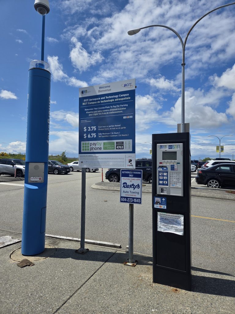 Please purchase a ticket for the Visitor Parking Lot at the machine located in front of the entrance to the BCIT Aerospace campus or pay using the Pay By Phone application.
